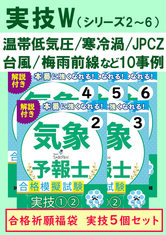 【合格祈願福袋】として、気象予報士合格模擬試験の5個セットと3個セットを販売中! 5個セットは定価の10%引き、3個セットは定価の7%引きです。 福袋をお買い上げの方には、1回のご購入につき1個 TeamSABOTENからの合格祈願グッズを差し上げます。